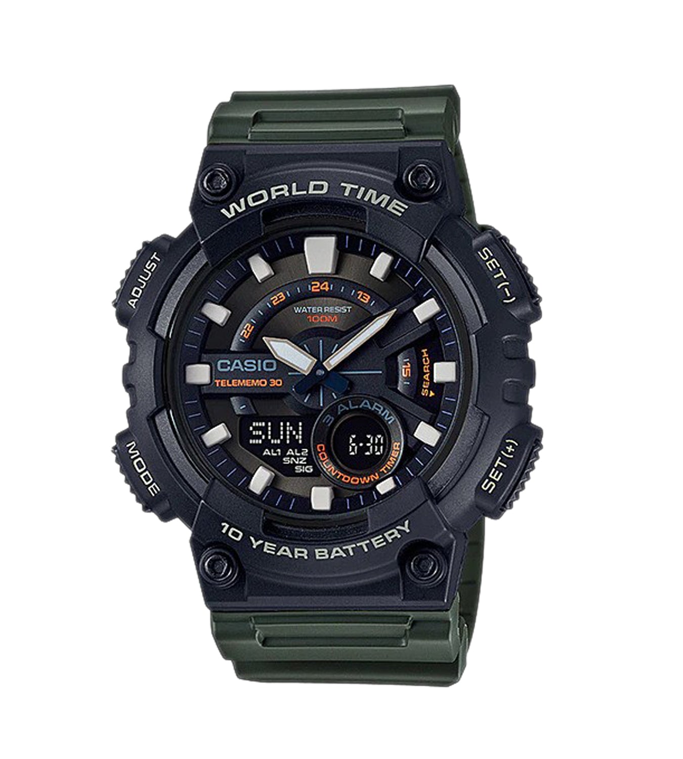 The Casio AEQ-110W-3AVDF is a digital watch designed for everyday wear, offering a blend of functionality, affordability, and a sporty look. Here’s a breakdown of its features to help you decide if it’s the right timepiece for you: