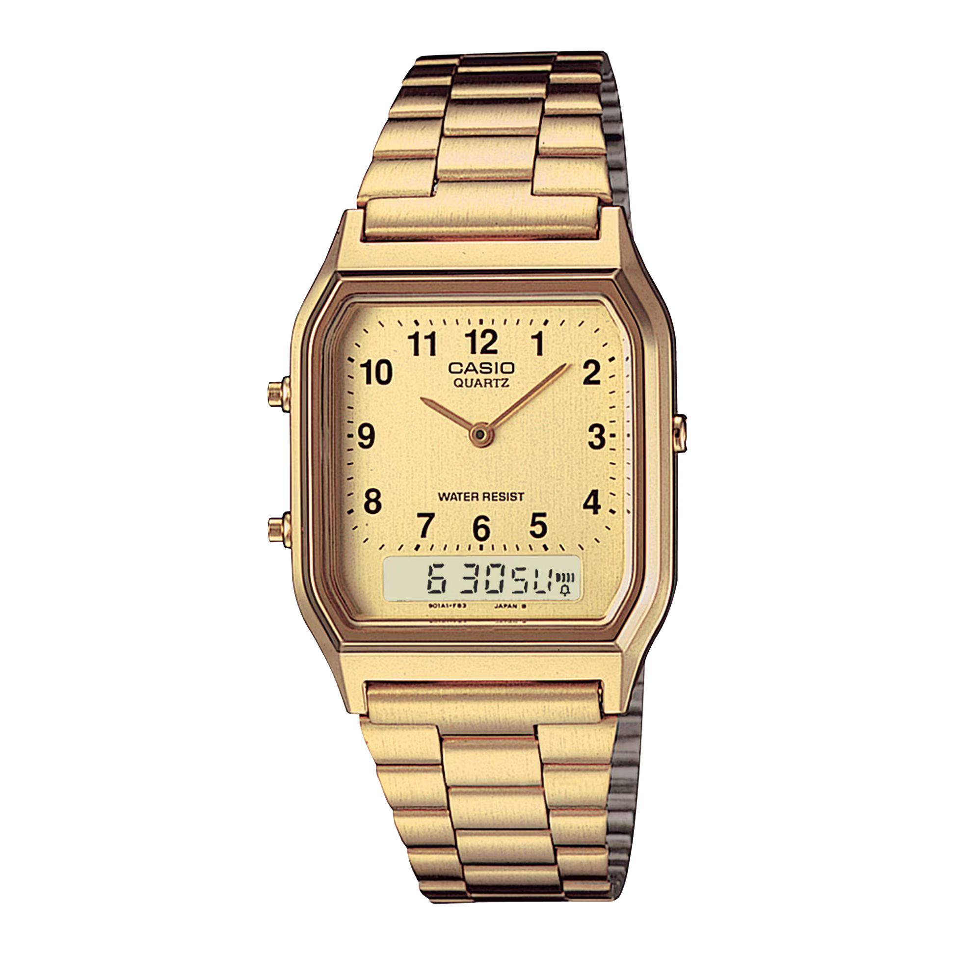 The Casio AQ-230GA-9BMQ combines classic analog style with digital functionality in a sleek gold-tone design. Featuring dual time display, stopwatch, daily alarm, and auto calendar, it delivers both elegance and practicality. Its stainless steel bracelet and retro square dial make it a timeless accessory perfect for everyday wear or special occasions.Now available at Posterboy.com.