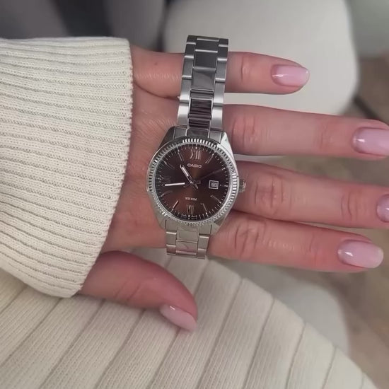 The Casio LTP‑1302DD‑5A2VDF is an elegant women’s wristwatch melding vintage charm with contemporary design, checkout more watches at posterboystore.com. Its radiant champagne sunray dial, paired with a sleek silver-tone stainless steel case and bracelet, exudes refined femininity. Encased in mineral glass, this timepiece features a date display at 3 o’clock and is powered by a reliable quartz movement -- boasting accuracy within ±20 seconds per month. With water resistance up to 50 meters and a comfortable 67 gram weight, it's perfect for daily wear whether amidst rain's drizzle or casual handwashing.