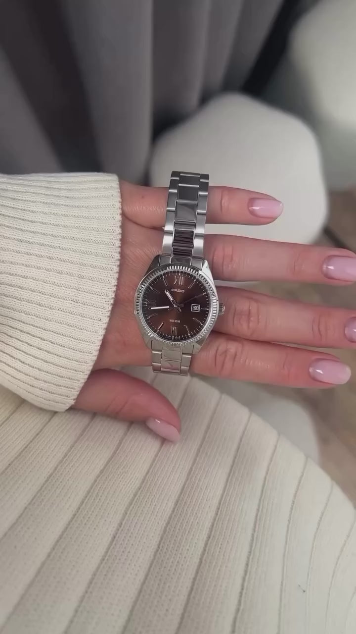 The Casio LTP‑1302DD‑4A2VDF is an elegant women’s wristwatch melding vintage charm with contemporary design, checkout more watches at posterboystore.com. Its radiant champagne sunray dial, paired with a sleek silver-tone stainless steel case and bracelet, exudes refined femininity. Encased in mineral glass, this timepiece features a date display at 3 o’clock and is powered by a reliable quartz movement -- boasting accuracy within ±20 seconds per month. With water resistance up to 50 meters and a comfortable 67 gram weight, it's perfect for daily wear whether amidst rain's drizzle or casual handwashing.