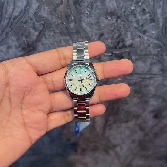 The Casio LTP‑1302DS‑4A2VDF is an elegant women’s wristwatch melding vintage charm with contemporary design, checkout more watches at posterboystore.com. Its radiant champagne sunray dial, paired with a sleek silver-tone stainless steel case and bracelet, exudes refined femininity. Encased in mineral glass, this timepiece features a date display at 3 o’clock and is powered by a reliable quartz movement -- boasting accuracy within ±20 seconds per month. With water resistance up to 50 meters and a comfortable 67 gram weight, it's perfect for daily wear whether amidst rain's drizzle or casual handwashing.