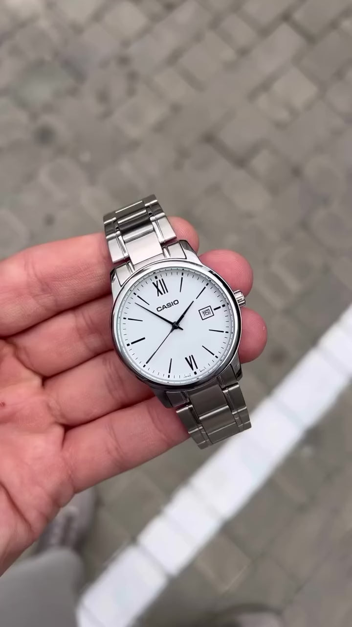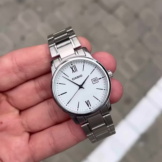 The Casio LTP-V002D-7B3UDF is a sleek and timeless ladies’ watch designed for everyday elegance. It features a clean white dial with easy-to-read Arabic numeral hour markers and a date display at the 3 o’clock position, combining simplicity with functionality. The polished stainless steel case and bracelet add a touch of sophistication, making it versatile enough for both casual wear and formal occasions. Powered by reliable quartz movement and water-resistant for daily use, this watch is a perfect blend of style and practicality — available at Posterboystore.com at the best market rates.