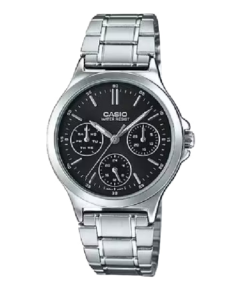 The Casio LTP-V300D-1AUDF is a stylish and versatile women's timepiece that blends elegance with everyday functionality. Featuring a sleek black dial, stainless steel band, and three sub-dials for day, date, and 24-hour time, this watch is perfect for those who appreciate both fashion and practicality. Ideal for work or casual wear, it's a timeless addition to your collection—now available at at posterboystore.com.