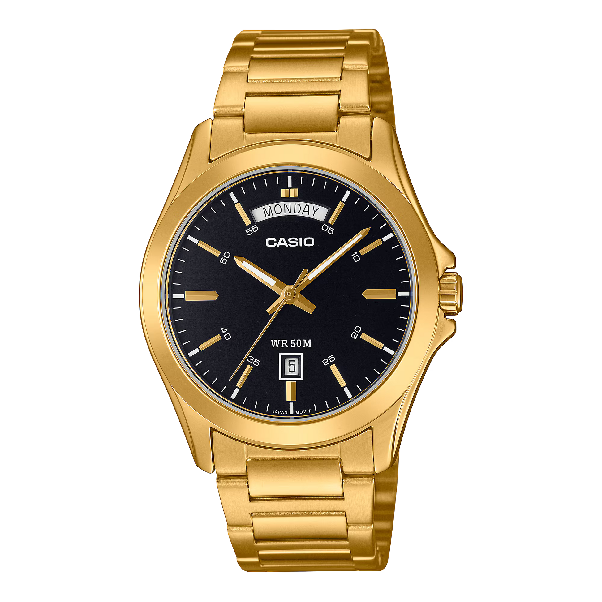 Elevate your everyday style with the Casio MTP-1370G-1AVDF. This elegant timepiece features a striking black dial with gold-tone accents, complemented by a two-tone stainless steel bracelet for a refined look. Day and date display add practicality, while water resistance ensures durability for daily wear. A perfect blend of sophistication and reliability — ideal for both work and leisure. order now at posterboystore.com and experience timeless reliability!