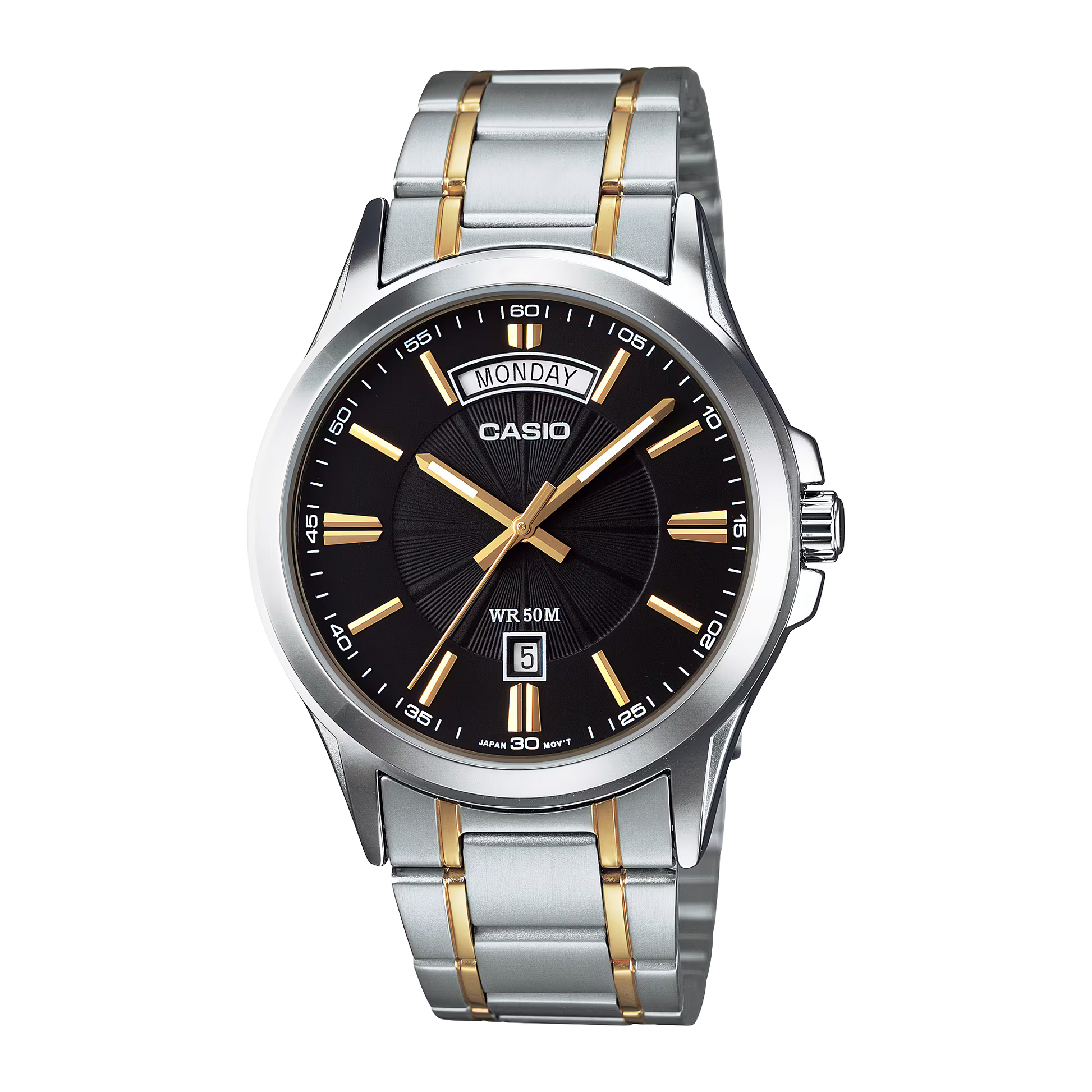 The Casio MTP-1381G-1AVDF combines classic sophistication with everyday functionality. Featuring a sleek black dial, gold-tone stainless steel case, and matching bracelet, this timepiece exudes timeless elegance. Its day and date display add practicality, while water resistance ensures durability for daily wear — a perfect blend of style and performance for any occasion. order now at posterboystore.com and experience timeless reliability!