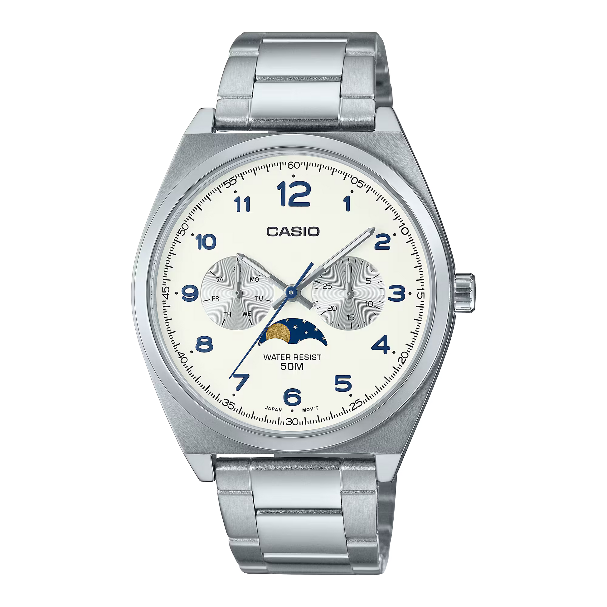 Casio MTP-M300D-7AVDF blends classic elegance with everyday durability. Featuring a clean white dial, multi-function sub-dials, and a polished stainless-steel bracelet, this timepiece delivers a refined look suitable for work or casual wear. Reliable quartz movement ensures accurate timekeeping, while its sturdy build makes it a long-lasting essential.