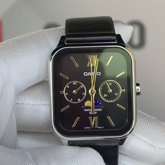 Buy the Casio MTP-M305L-1A2VDF, a sophisticated analog timepiece designed to capture the beauty of the moon and the rhythm of time, at posterboystore.com. Featuring a sleek black dial with multiple inset dials, this watch uniquely tracks lunar phases -- perfect for those who appreciate both style and celestial elegance.